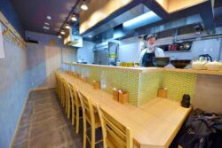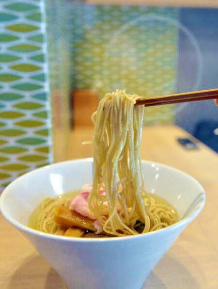 As I approached the shop I was delighted to see white noren curtains and lights by the doorway which gave the place an air of cleanliness and elegance. I purchased a shio salt ramen for ¥800, a regular menu item, from the ticket machine outside the shop. “Welcome!” Katsuhiko Seiwa, the 32-year-old manager, greeted me with a friendly smile and voice as I sat down at the eight-seat counter. It took less than five minutes for my order to be placed in front of me.
