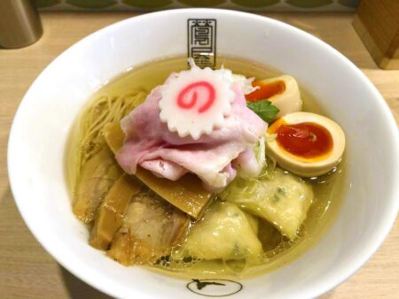 Special shio ramen, ¥1300, with extra topping wonton and harf-boiled egg.