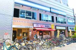 The shop is located on the first floor of a building in front of the station, but its view is slightly obscured from the street.