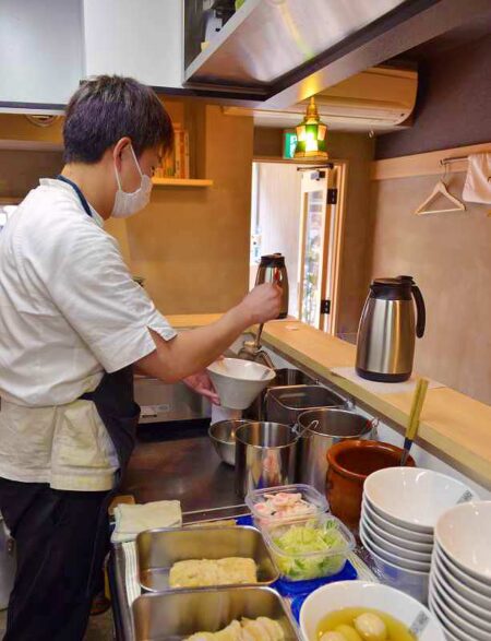 “The broth only uses seafood and is made with no animal ingredients,” Seiwa explained. Blending kombu, iriko dried fish and katsuobushi dried bonito flakes, he makes the soup every day, imitating a style in Japanese cuisine known as ichiban-dashi, first broth of the day.