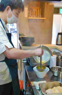 Manager Katsuhiko Seiwa adds in a special sauce to enrich the taste of ramen.