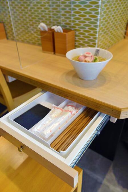 Chopsticks, paper aprons, and wet wipes are smartly stored in counter drawers. The idea was to save space as partitions have been attached amid the coronvirus pandemic.