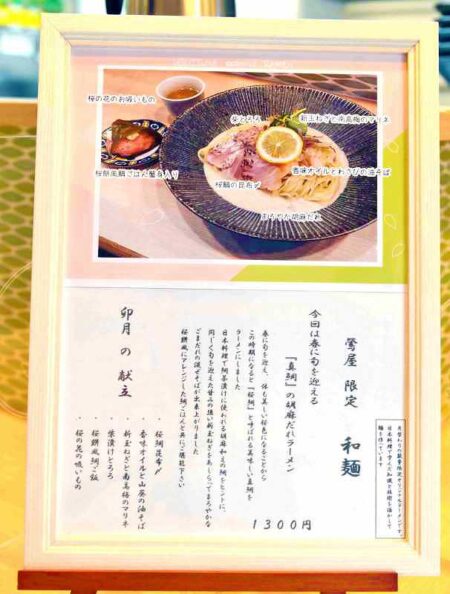 Taking advantage of this experience, Seiwa has been offering limited time ramen specials during dinner hours. The spring special, which ended with the Golden Week holidays, was sea bream with sesame sauce. He showed me magnificent sea breams that had just arrived which would be used for the dish. He paired the noodles cooled in cold water with a mild sesame and tofu-based sauce. The toppings included kobujime sea bream marinated in kelp, marinated freshly sprouted onion and Nanko ume plums from Wakayama Prefecture, as well as yam, shibazuke pickles and a slice of lemon. Sea bream rice and cherry blossom soup was served along with the ramen for 1,300 yen. The dish was very successful.