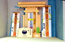 Shinto altar and shrine plaque with yatagarasu in the shop.