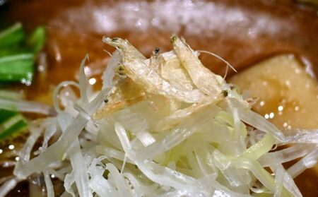 Small dried shrimps on top of white leeks give the dish extra flavor. Other toppings include two kinds of homemade chashu (pork shoulder and chicken breast) cooked at low temperature, mizuna herbs, and extra-thick menma (bamboo shoots). The overall result is a signature dish that has a truly unique taste.