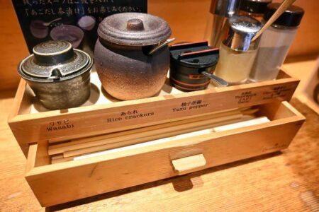 Finally, if you add rice to the remaining soup, it becomes ochazuke (rice in dashi soup). Wasabi and arare (Japanese crackers) are placed at the counter so you can finish the entire dish.