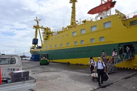 People disembarking from the Tachibana Maru upon arrival at Hachijo Island.