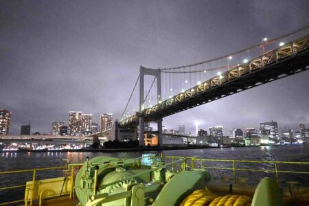 A short time after leaving Takeshiba Pier, the boat passes under the Tokyo Rainbow Bridge. The view of Tokyo at night is beautiful.