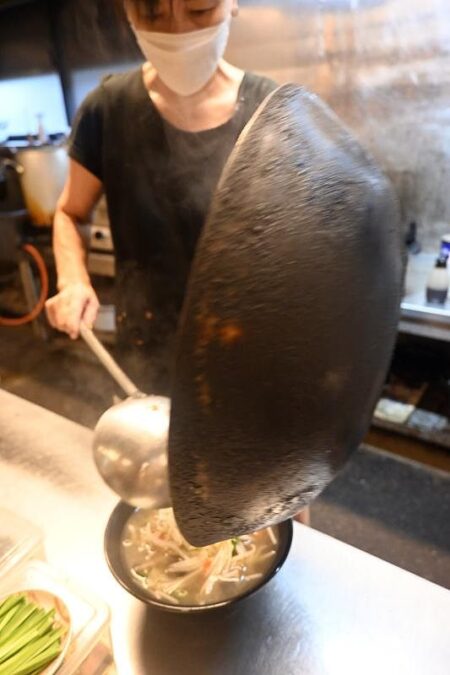 Tanmen is a kind of ramen where stir-fried vegetables and meat are placed on top of noodles. Yamaguchi put a big helping of vegetables in a large wok and began to stir-fry them, producing a loud sizzling sound. In the middle of the stir-fry, she added about two tablespoons of green pepper paste. Only then did she close her eyes and turn her face away. “If I don’t do this, the smell will be so strong that it will make me cry,” she said. I was excited to see how spicy it would be.