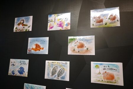 Drawings by Kinosaku, a picture book artist associated with Hachijo Island, hang in the shop.