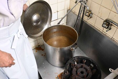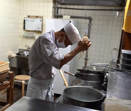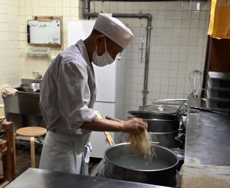 The store does not use the typical colander often found in ramen shops to boil noodles. The noodles are put directly into a large pot of simmering water. -