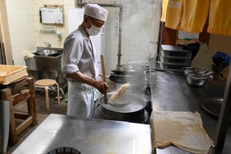 In time, he set up his own shop, although it is not clear when. Fusaaki said, “On a map from 1943, the shop’s name is on the opposite side of the street from where it is now. That means the shop was already there in 1943.” That was two years before the end of World War II. Later, the street in front of the shop was widened, and in 1944 the shop was relocated to Nishi-Yanagase, its current location. However, the entire area, including the shop, was burned to the ground in an air raid in 1945. For several years after the war, the family lived through hard times. When flour became available again, they reopened the shop.