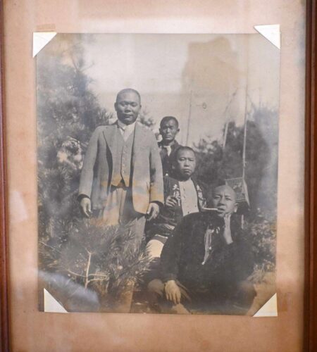 An old photo displayed in the shop. Fusaji Kamiya, the founder, is at the front on the right.