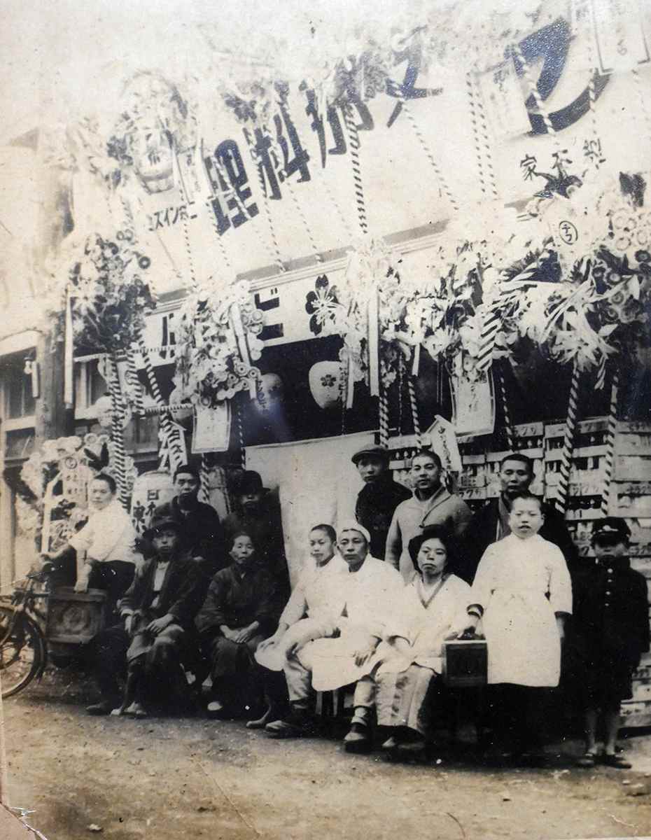 A photo taken when the shop opened at its current location in 1944. Fusaji is wearing a hachimaki on his head. -