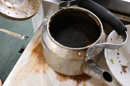 Kaeshi sauce is poured from a kettle into a bowl to be combined with chicken broth. -