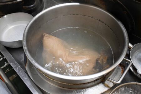 Chicken broth is made in a large pot. Chicken bones are put in a bag to give the broth a distinct taste. -