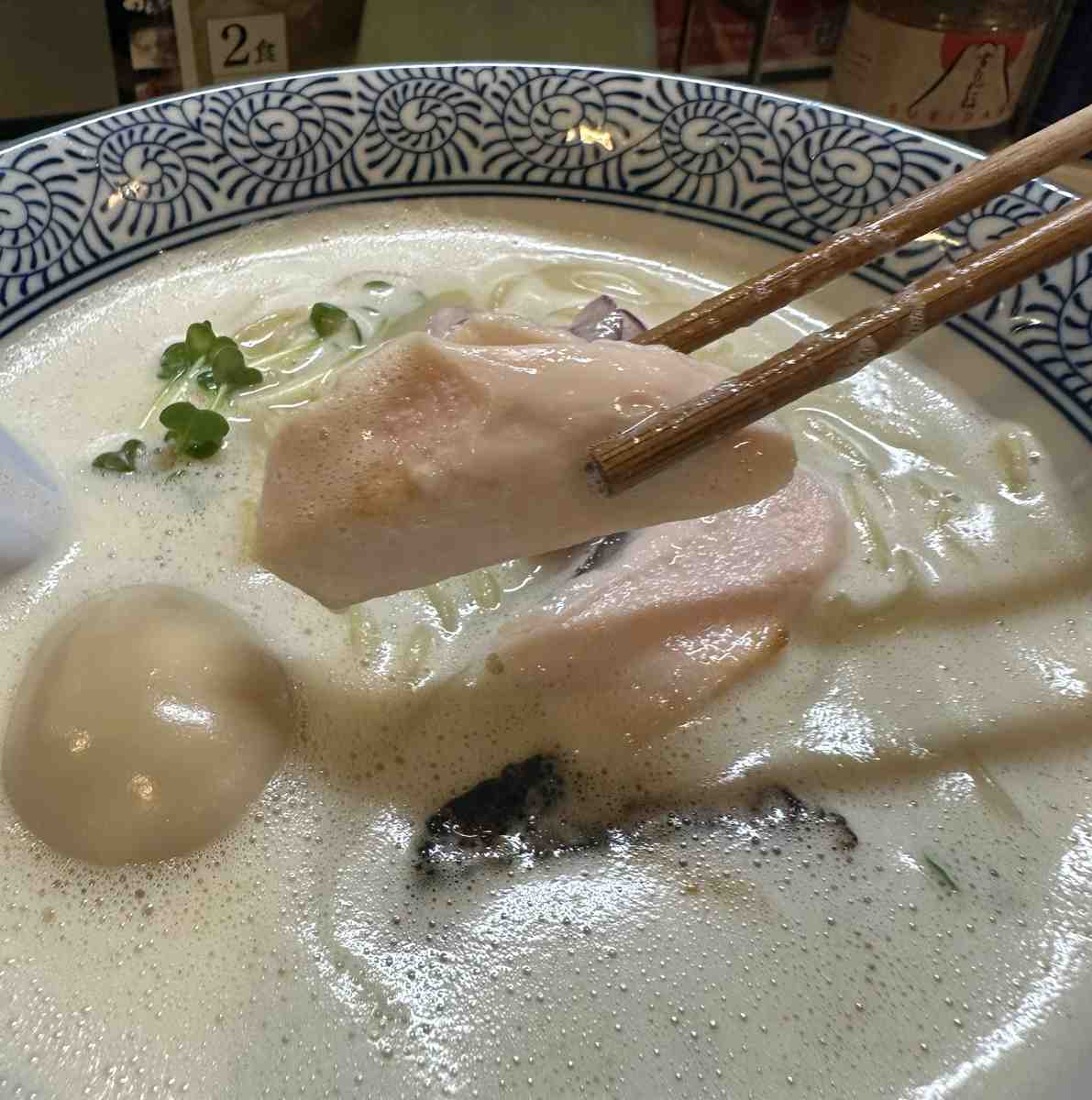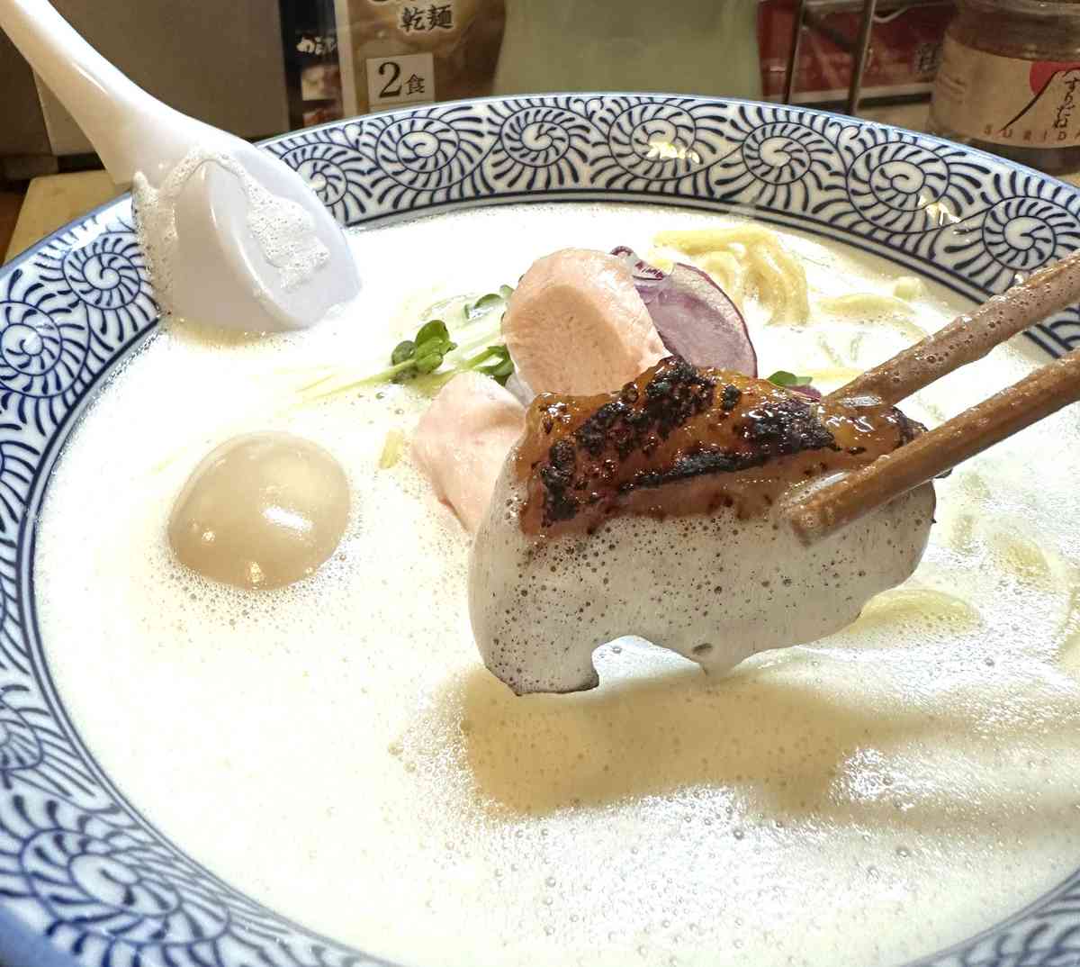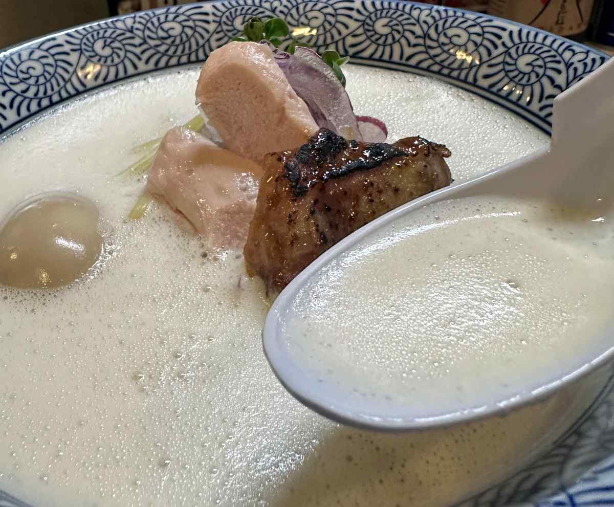 “I use whole Kosyu Jidori chicken,” Furuya explained as he used a hand blender to create a beautiful bowl of white, foamy chicken broth. He placed the ramen on the counter in front of me, and I took a sip of the soup. It was delicious and creamy, and I could really taste the flavor of the chicken.