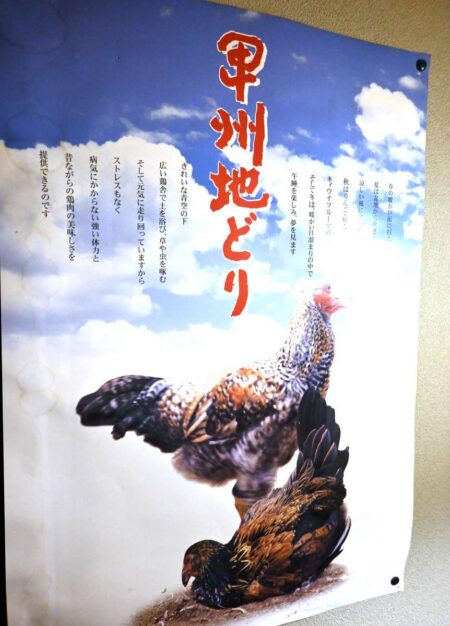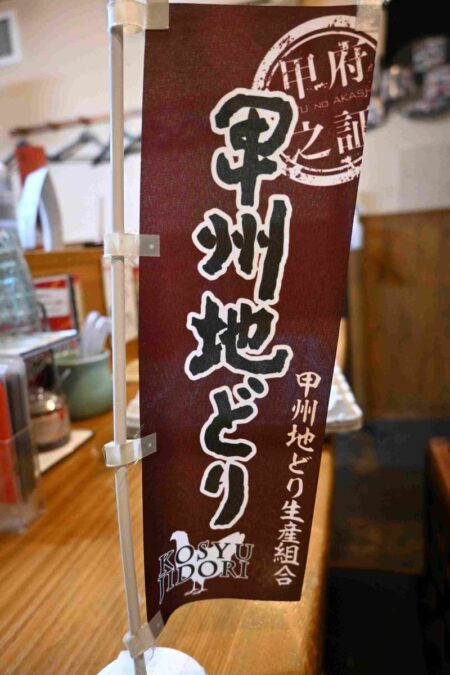 A small Kosyu Jidori chicken banner on the counter