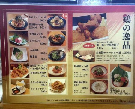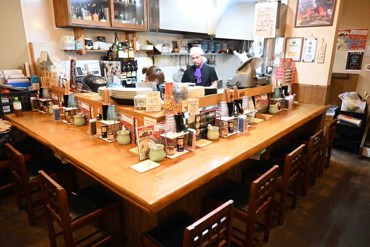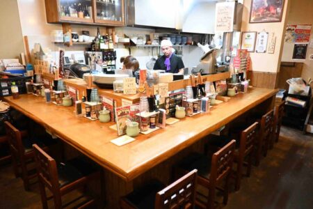 At his establishment, there are also izakaya-style dishes from the yakitori restaurant days. Many customers enjoy drinking while eating a la carte dishes such as chicken giblets, gyoza and fried chicken before finishing off with a bowl of ramen. There is also a large room upstairs with table seating.