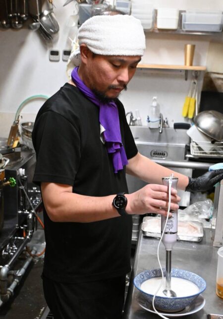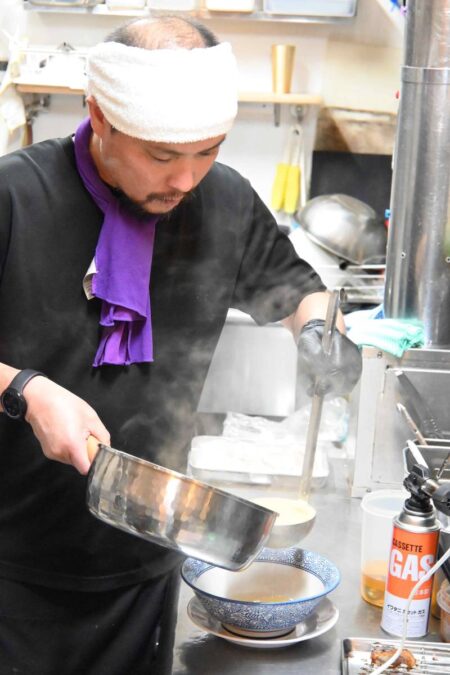 Furuya puts paitan broth in a bowl.