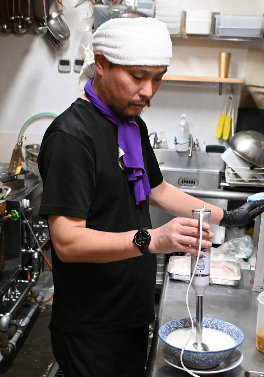Furuya whisks the broth with a hand blender.
