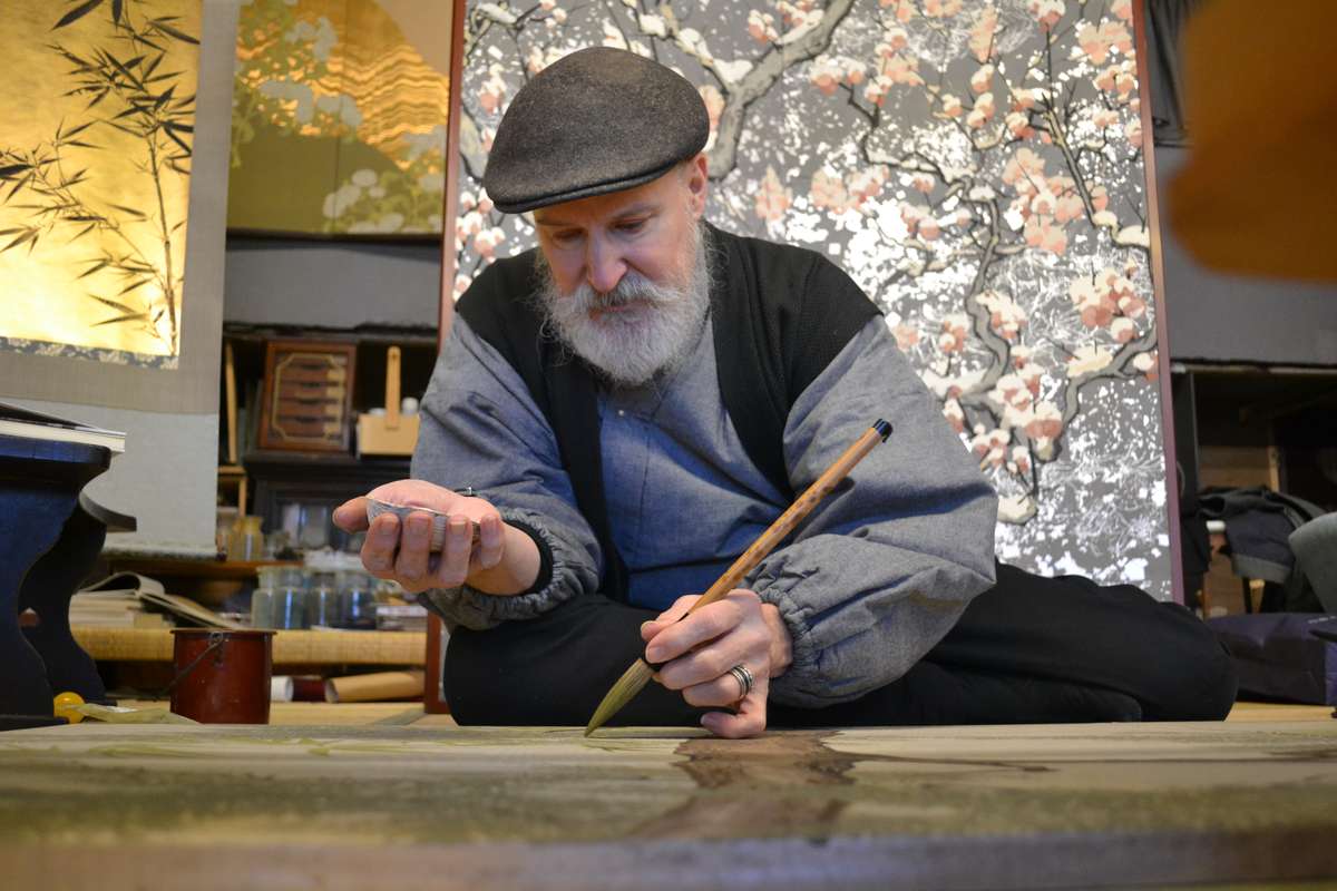 Allan West specializes in painting scenes from nature with pigments made from the crushed minerals characteristic of traditional Japanese nihonga art.