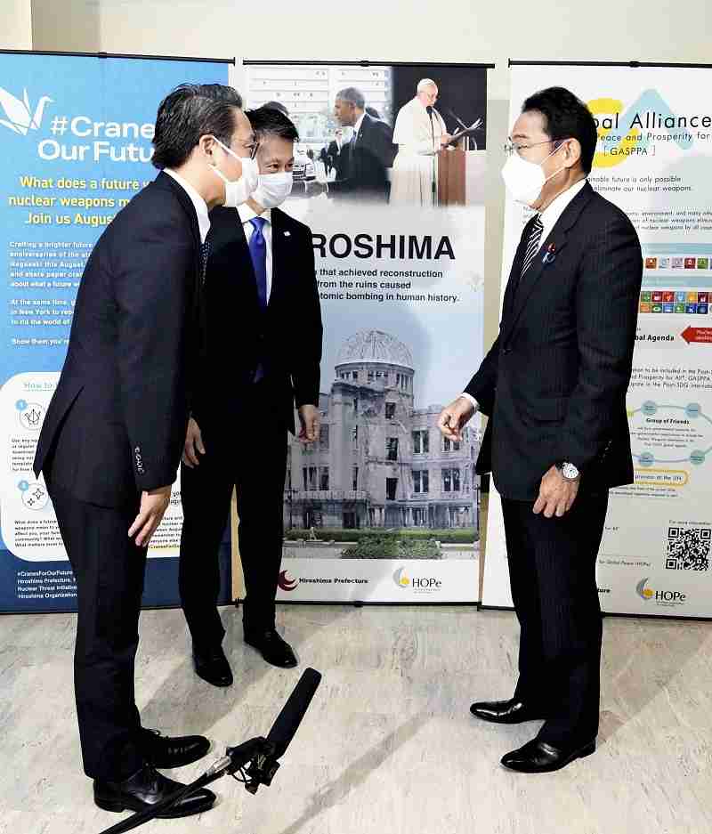 Prime Minister Fumio Kishida, right, meets with Nagasaki Gov. Kengo Oishi and Hiroshima Gov. Hidehiko Yuzaki at an exhibition on the abolition of nuclear weapons in New York on Monday.
