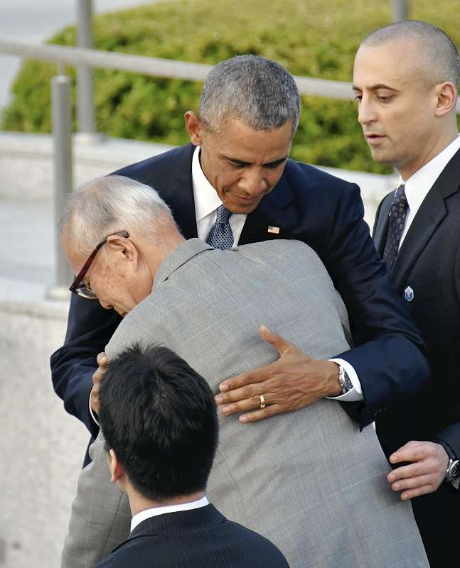 Then U.S. President Barack Obama hugs A-bomb survivor Shigeaki Mori at Hiroshima Peace Memorial Park in Hiroshima City on May 27, 2016.
