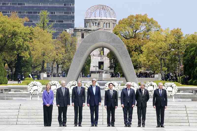 Then U.S. Secretary of State John Kerry, fourth from left, and then Foreign Minister Fumio Kishida, fifth from left, pose with other G7 dignitaries after offering flowers at a memorial monument for A-bomb victims at Hiroshima Peace Memorial Park in Hiroshima City on April 11, 2016.