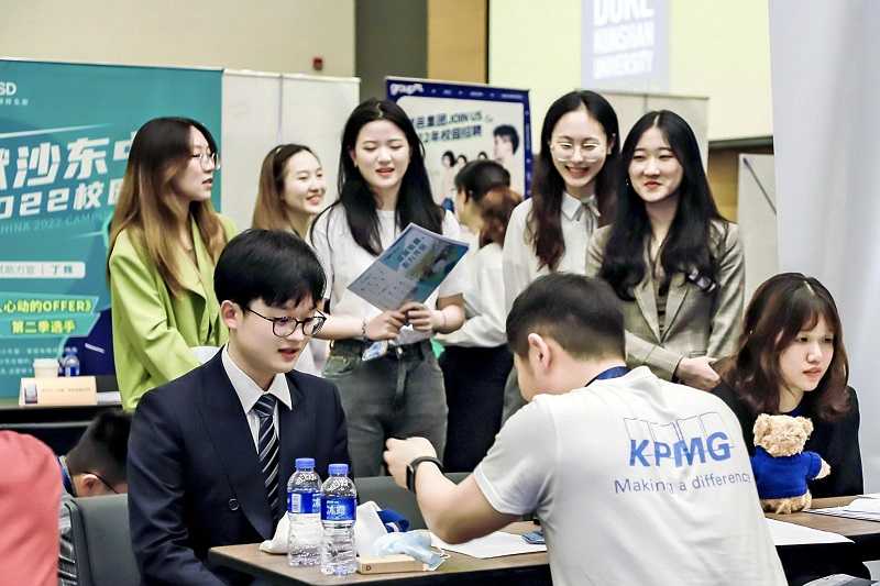 Students attend a job fair at a university in China’s coastal Jiangsu Province in October 2021.