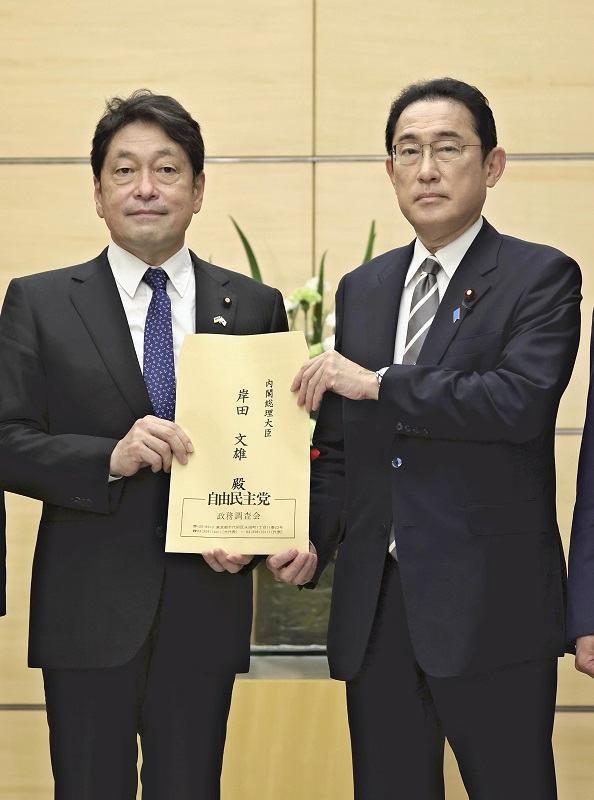 Prime Minister Fumio Kishida, right, receives proposals on national security from Itsunori Onodera, chairman of the Liberal Democratic Party’s Research Commission on Security, in May.