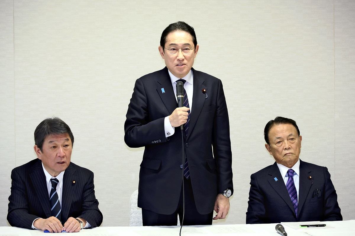 Prime Minister Fumio Kishida, center, speaks at a meeting of executives of the Liberal Democratic Party’s political reform headquarters. LDP Vice President Taro Aso, right, and LDP Secretary General Toshimitsu Motegi, are also seen.