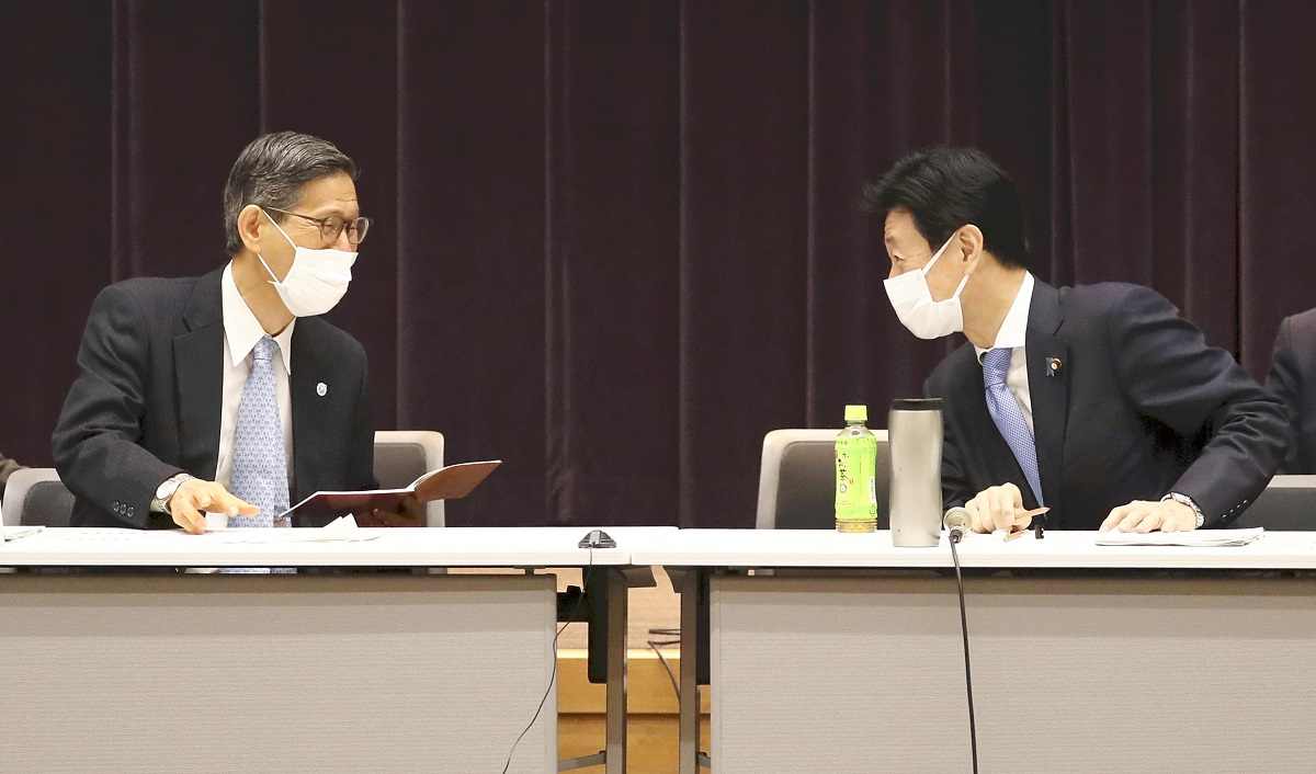 Shigeru Omi, head of the government advisory committee on measures against the coronavirus, left, and Yasutoshi Nishimura, the minister in charge of government COVID-19 measures, talk before a meeting of the committee in Tokyo on Friday.