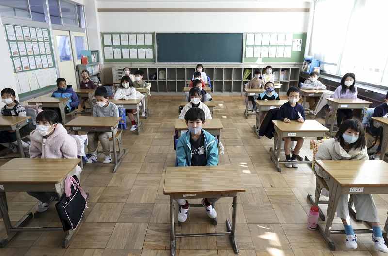 Students at Katsushika Elementary School are seated with space between them in the classroom to prevent the spread of the novel coronavirus on Jan. 8 in Katsushika Ward, Tokyo.