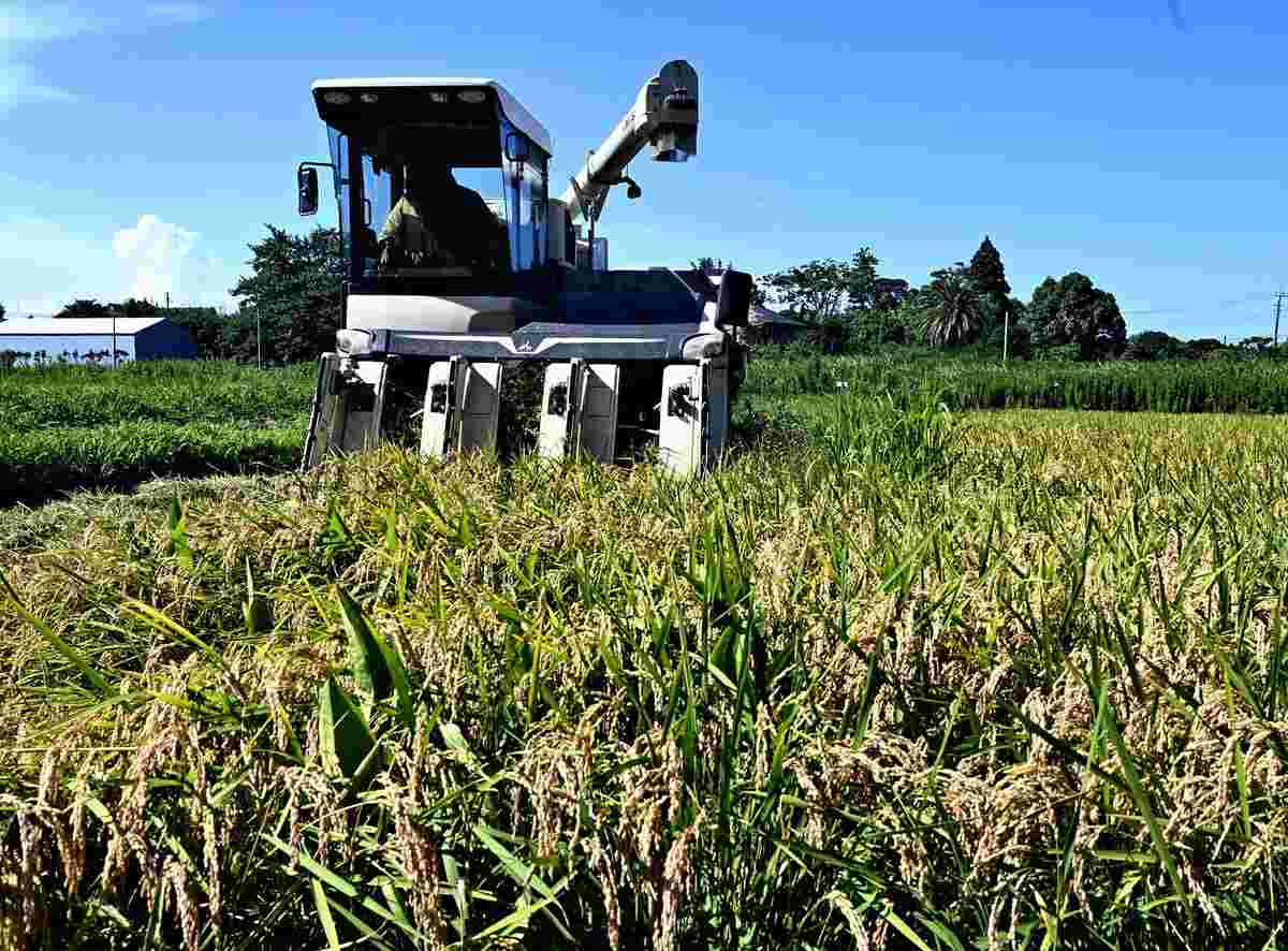 A farmer in a combine harvester harvests rice in Isumi, Chiba Prefecture, on July 22.