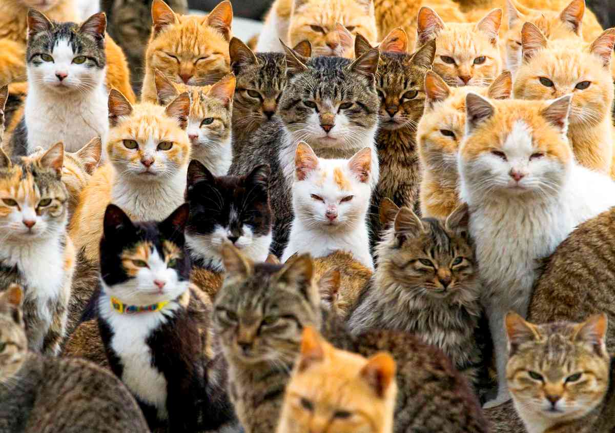 Cats crowd the harbor in Aoshima, Ehime Prefecture, in February 2015.