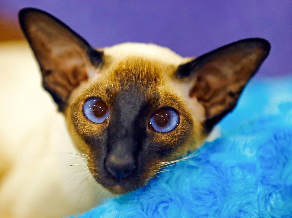 A Siamese relaxes in his cat bed at the annual cat show in Del Mar, Calif., in January 2015.