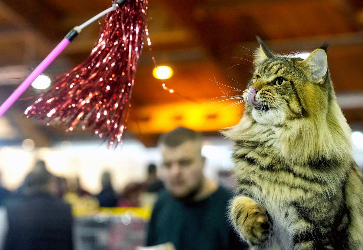 A Maine Coon cat plays during the international pet industry fair Zoo Expo 2022 in Riga in November 2022.