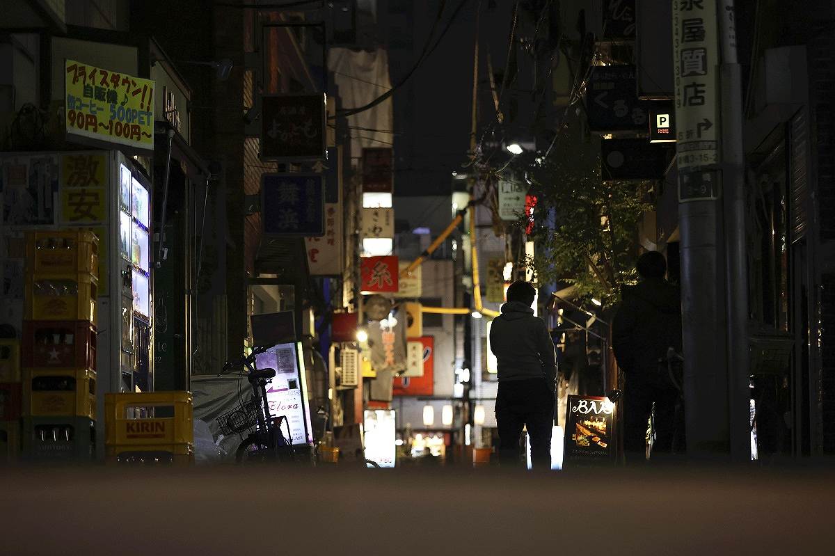 It’s after 10 p.m. Monday in an entertainment district in Tokyo. Although dining and drinking establishments adhering to the official request to shut early to help stop the spread of the coronavirus are closed, the lights were still on in several bars.