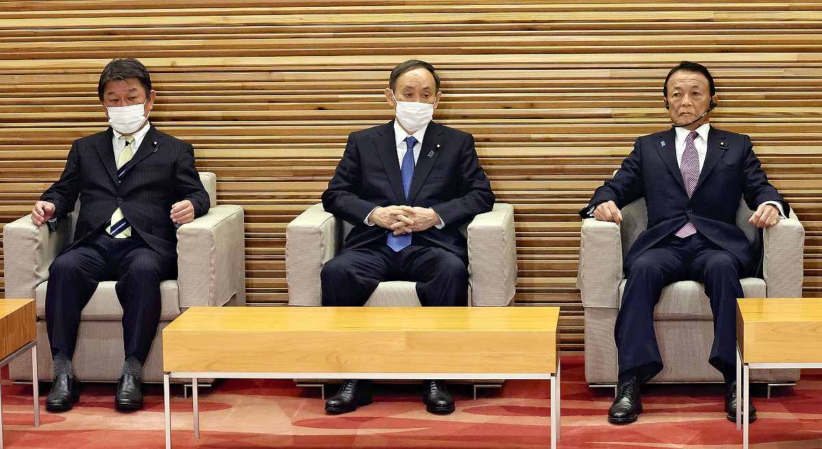 Prime Minister Yoshihide Suga (right: Deputy Prime Minister and Finance Minister Aso, left: Foreign Minister Motegi).