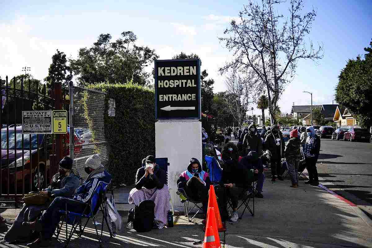 People without appointments wait in line for the potential chance to receive a Covid-19 vaccination at the Kedren Community Health Center on Monday in Los Angeles.