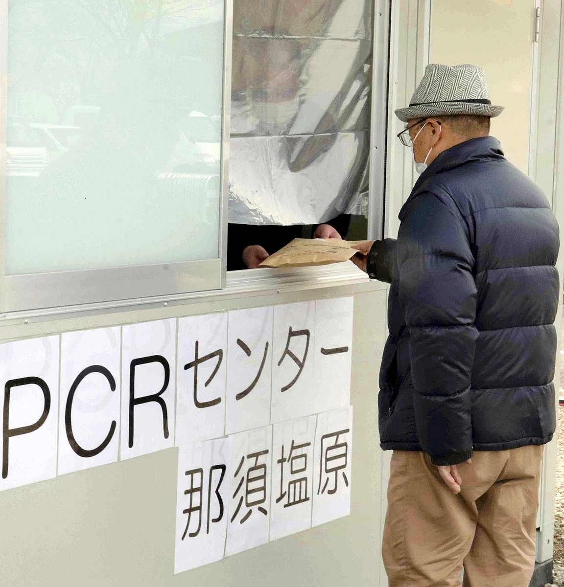 A man hands in his sample at a PCR test facility in Nasushiobara, Tochigi Prefecture on Jan. 26.