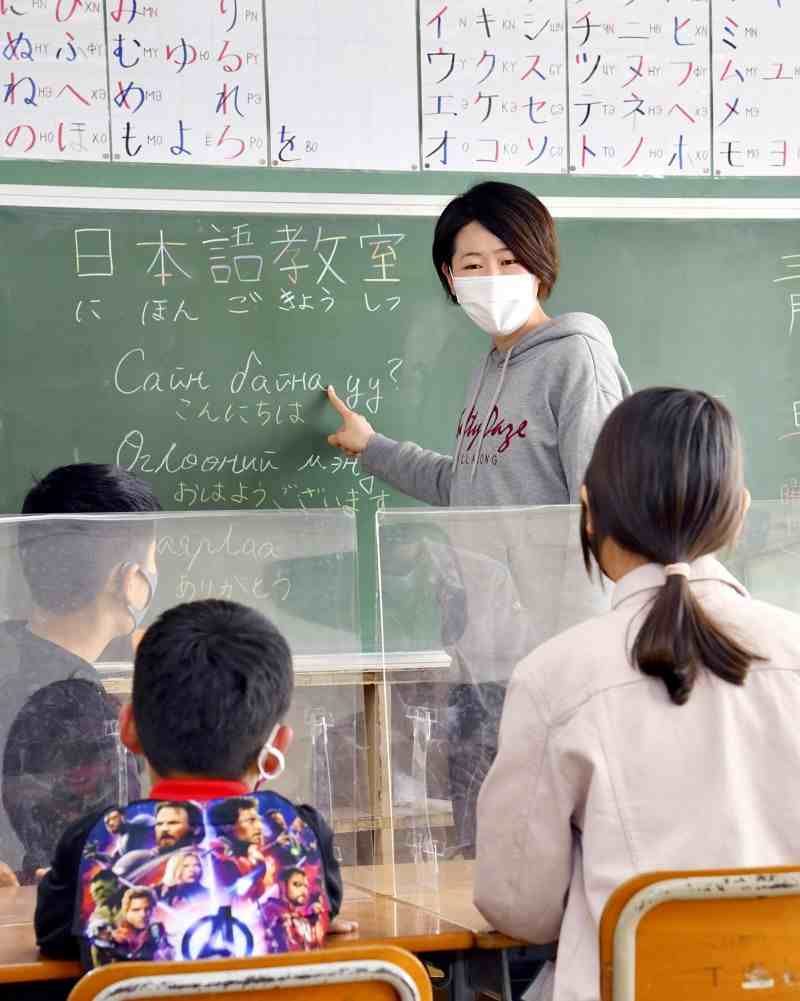Saori Yoda teaches Japanese to Mongolian students at an elementary school in Matsudo, Chiba Prefecture, on March 12.