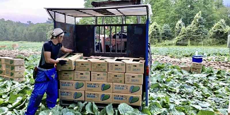 A member of the Japan Overseas Cooperation Volunteers helps with harvesting cabbage in Tsumagoi, Gunma Prefecture.