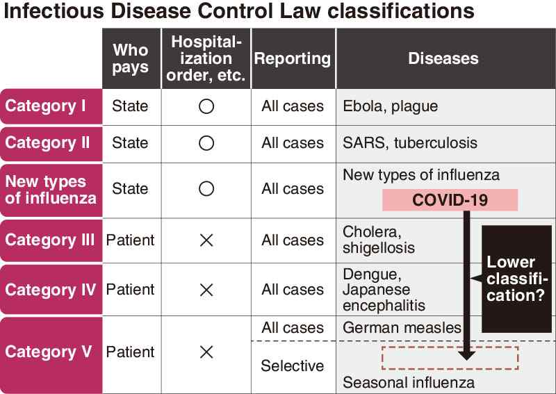 The Infectious Diseases Control Law classifies infectious diseases from Category I to Category V based on their level of risk. There is also a category for “new types of influenza and other infectious diseases,” which includes COVID-19, and it has been treated as the equivalent of Category II.