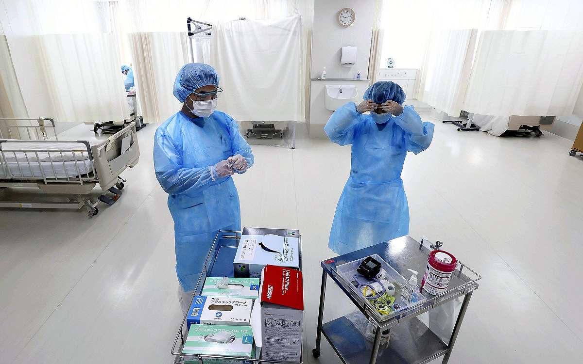 Nurses prepare to treat COVID-19 patients at a hospital in Kashiwa, Chiba Prefecture, on Feb. 10, 2021.