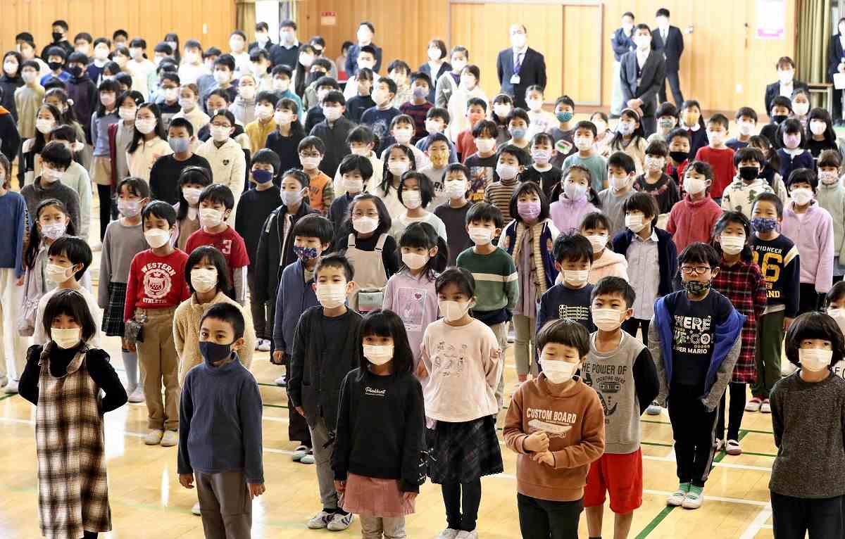 Elementary school students wear masks as they sing their school song in Osaka in March 2022.