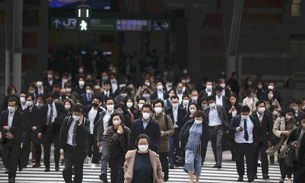People are seen heading to work wearing masks in Tokyo, on March 13.