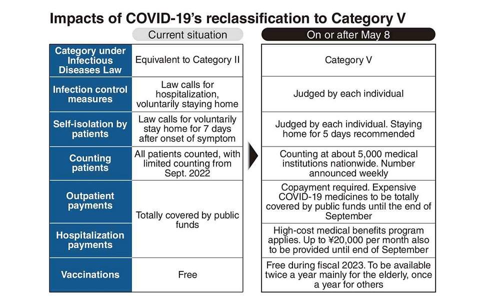 After COVID-19 is downgraded from the equivalent of Category II to Category V under the Infectious Diseases Law on May 8, major changes will be introduced regarding infection control measures, medical expenses borne by COVID-19 patients and patients’ voluntary efforts to stay home.