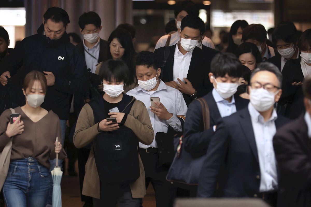 Many commuters wear masks in Chiyoda Ward, Tokyo, on Monday morning despite the downgrade of COVID-19’s legal classification.